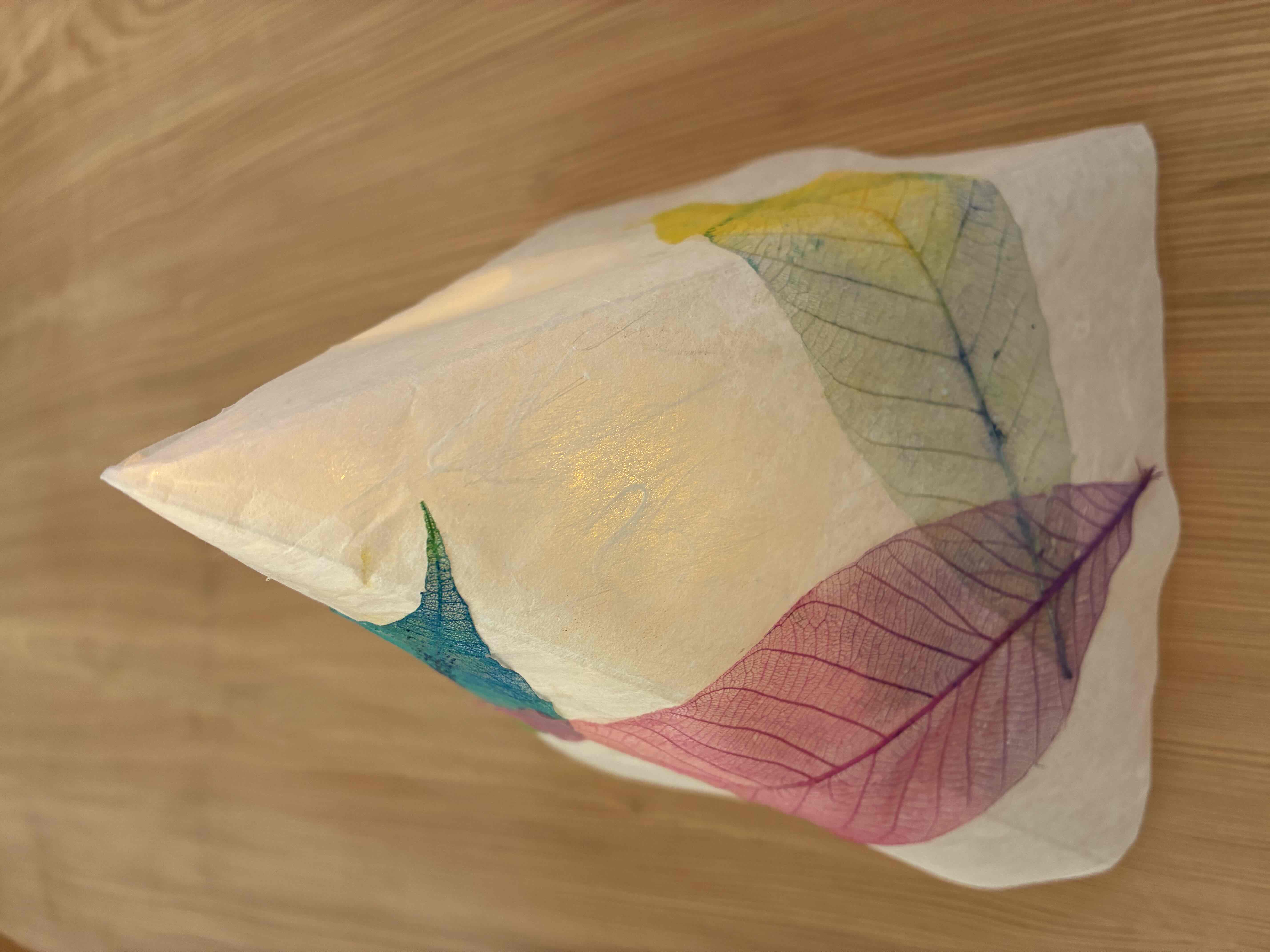 葉っぱを好きな色に着色して和紙に貼り、骨組みを組み立てて完成。