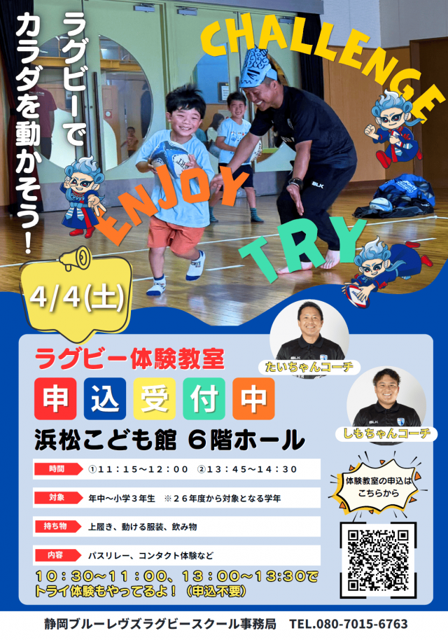 イベント情報 条件で探す 対象 どなたでも 0歳 1歳~3歳 4歳以上の未就学児 小学生以上 パパ・ママ マタニティ なにする? あそぶ つくる まなぶ 子育て 絞り込む あそぶ 4歳以上の未就学児 / 小学生以上 【抽選】〈HMSportsバスケットボールスクール〉バスケットに挑戦!!①9:30~10:30 日 3/30(月) 時間 ①9:30~10:30 対象 年中~小学2年生(保護者同伴) 詳細を見る あそぶ 4歳以上の未就学児 / 小学生以上 【抽選】〈HMSportsバスケットボールスクール〉バスケットに挑戦!!②10:45~11:45 日 3/30(月) 時間 ②10:45~11:45 対象 年中~小学2年生(保護者同伴) 詳細を見る あそぶ 4歳以上の未就学児 / 小学生以上 【抽選】〈HMSportsバスケットボールスクール〉バスケットに挑戦!!③13:30~14:30 日 3/30(月) 時間 ③13:30~14:30 対象 小学3年生以上(保護者同伴) 詳細を見る あそぶ 1歳~3歳 / 4歳以上の未就学児 【抽選】〈ジムナススポーツクラブ〉逆上がり・跳び箱に挑戦!! ①10:00~10:45 日 3/31(火) 時間 ①10:00~10:45 対象 年少・年中児 詳細を見る あそぶ 4歳以上の未就学児 / 小学生以上 【抽選】〈ジムナススポーツクラブ〉逆上がり・跳び箱に挑戦!! ②11:00~11:45 日 3/31(火) 時間 ②11:00~11:45 対象 年長・小学1年生 詳細を見る あそぶ 小学生以上 【抽選】〈ジムナススポーツクラブ〉逆上がり・跳び箱に挑戦!! ③13:00~13:45 日 3/31(火) 時間 ③13:00~13:45 対象 小学1・2年生 詳細を見る あそぶ 小学生以上 【抽選】〈ジムナススポーツクラブ〉逆上がり・跳び箱に挑戦!! ④14:00~14:45 日 3/31(火) 時間 ④14:00~14:45 対象 小学3・4年生 詳細を見る あそぶ 4歳以上の未就学児 / 小学生以上 〈静岡ブルーレヴズ〉ラグビー体験教室 日 4/4(土) 時間 ①11:15~12:00 ②13:45~14:30 対象 年中~小学3年生 ※2026年度から対象となる学年 (未就学児は保護者同伴) 詳細を見る 子育て 1歳~3歳 / パパ・ママ 音と遊ぼうリトミック ~2、3歳クラス~ 日 4/6(月) 時間 10:20~11:00 対象 2・3歳の子とその保護者 詳細を見る 12345